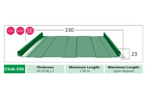 SelanjutnyaAtap Click 330 yang memiliki profile gelombang rendah untuk bentang pendek hingga menengah tanpa sambungan dengan cara pemasangan boltless menggunakan sistem click.